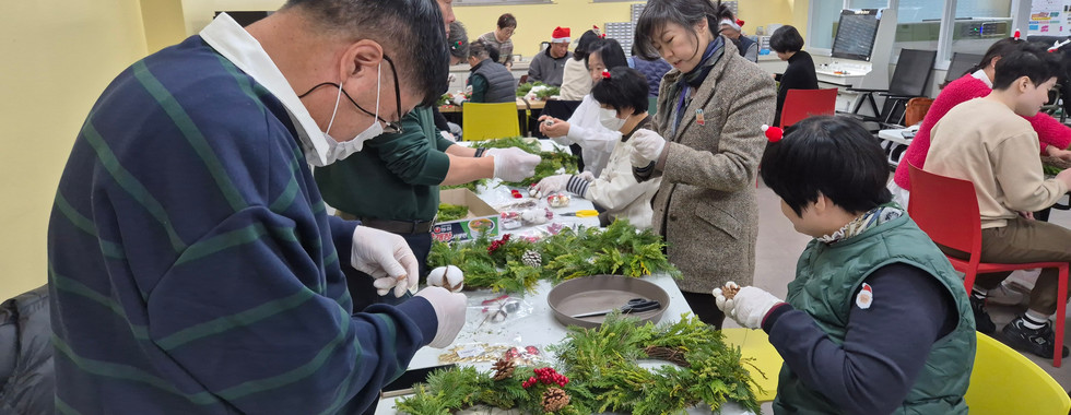 처음엔 서먹했던 손길이 점점 익숙해지고, 함께 고민하며 장식을 하나하나 달다 보니 어느새 웃음꽃이 활짝 피었습니다. 팀별로 2개씩 만든 리스는 하나씩 나눠 가지며 오늘의 추억을 각자의 공간에 담아가기로 했습니다.