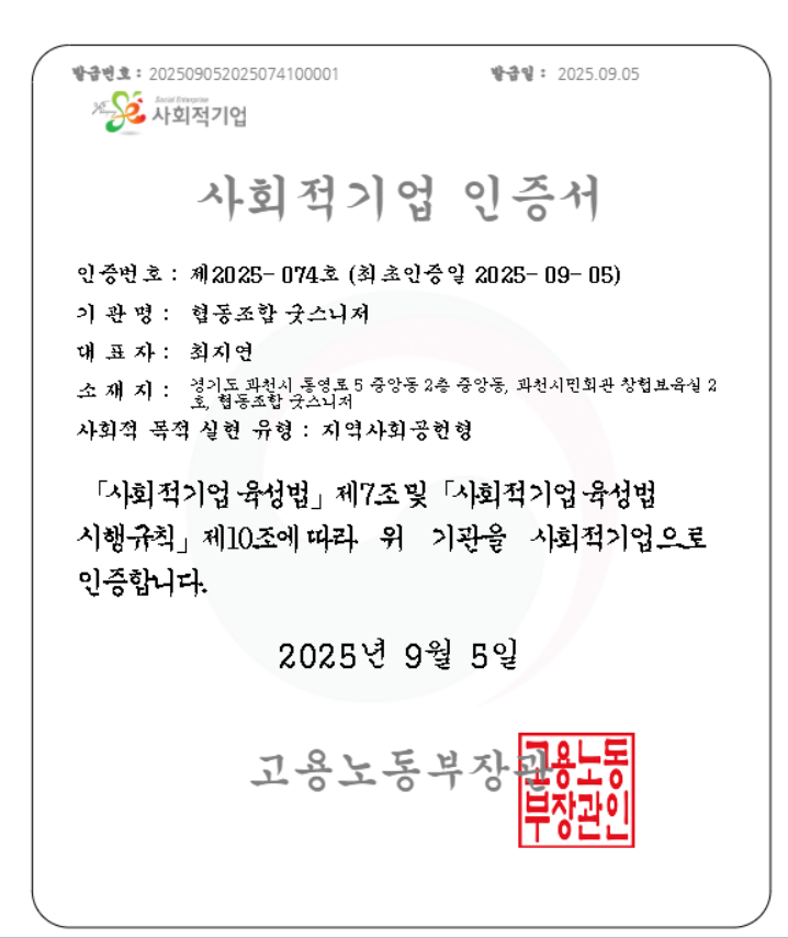 협동조합 굿스니저의 사회적기업 인증을 진심으로 축하하며, 앞으로도 우리나라 사회적경제 활성화를 위해 지속적인 활약을 펼쳐주시길 기원합니다.